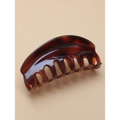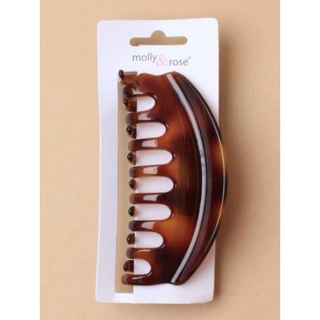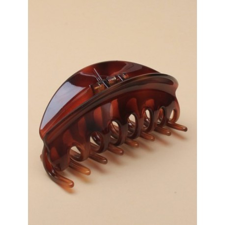 Tukevatekoinen kapea hiusklipsi. Pituus 10 cm, leveys 3,5 cm, korkeus 4,5 cm. Materiaali muovia. Väri ruskea.