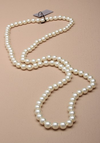 Helmikaulanauha tekohelmistä, pituus n. 98 cm. Helmen halkaisija n. 7 mm. Nauha yhtenäinen, ei lukkoa. Väri helmenvalkoinen.