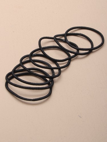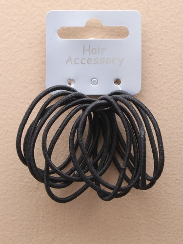 Pienet kangaspäällysteiset hiuslenkit. Kuminauhan paksuus n. 1,5 mm, lenkin ulkohalkaisija perusasennossa n. 2 cm.