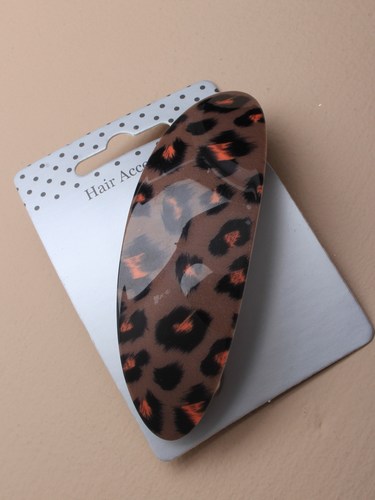 Muovinen soikea hiussolki, jossa printtinä eläinkuvio. Koko n. 9 x 3 cm. Solkiosa metallia. Värit pohjavärin mukaan: punainen ja ruskea