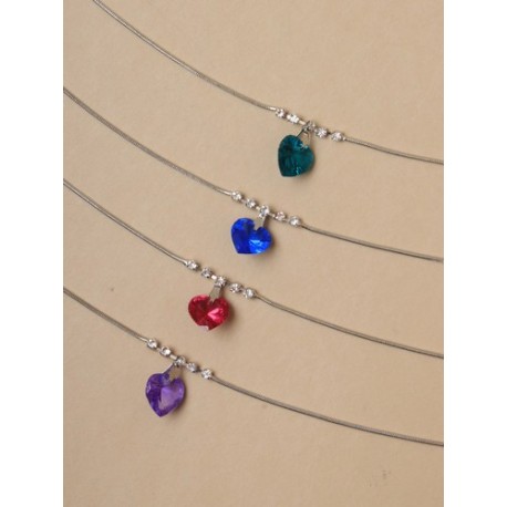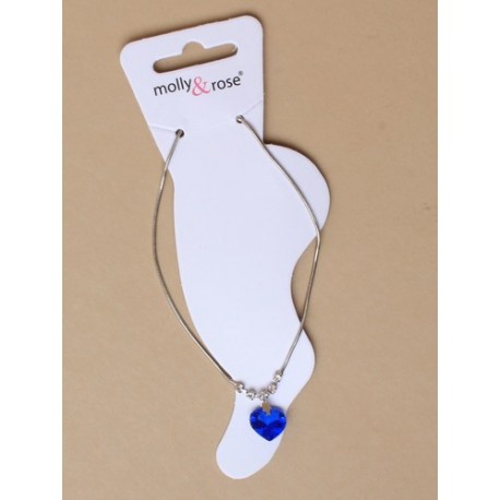 Nilkkaketju, jossa sydänkoru ja viisi strassikiveä. Sydänkoru toiselta puolelta sileä, toiselta puolelta kohokuvioitu. Koru kooltaan 1 cm. Ketju hopeanvärinen metallinen käärmeketju. Ketjun pituus 20 cm + lisäketjua 5 cm. Värit: Jade, sininen, pinkki. Väri lila loppuunmyyty.