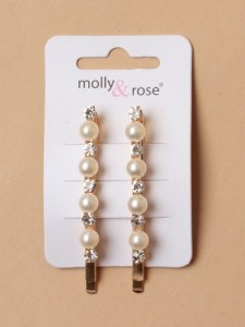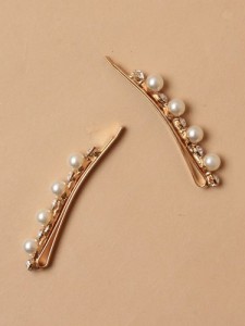 Kullanväriset hiuspinnit, joissa koristeena tekohelmiä ja korukiviä. Pinnien pituus 6,5 cm. Pakkauksessa 2 kpl.